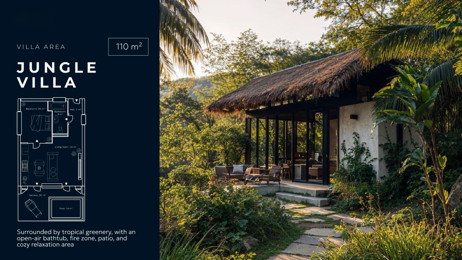 Jungle Villa 110 m²1 bed, 1 bathSurrounded by tropical greenery, open-air bathtub, fire zone, patio, and secluded relaxation area.From $395,00